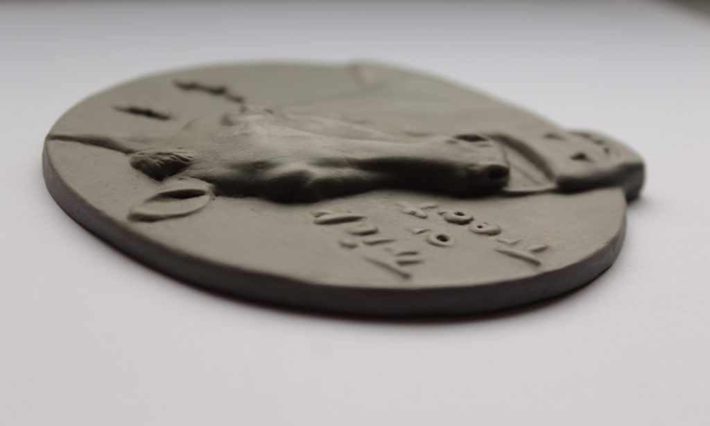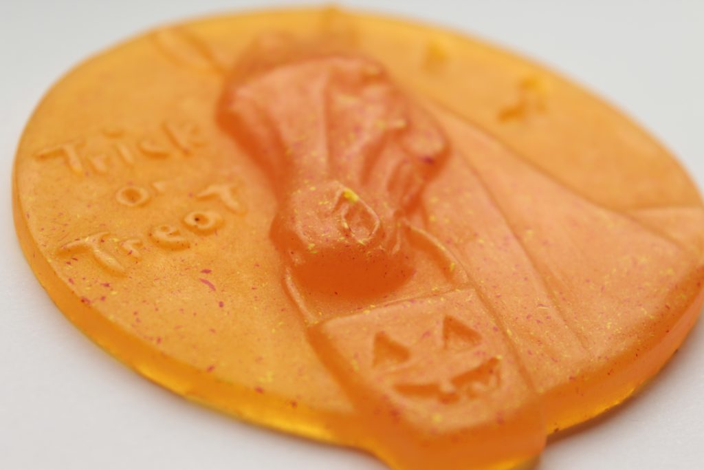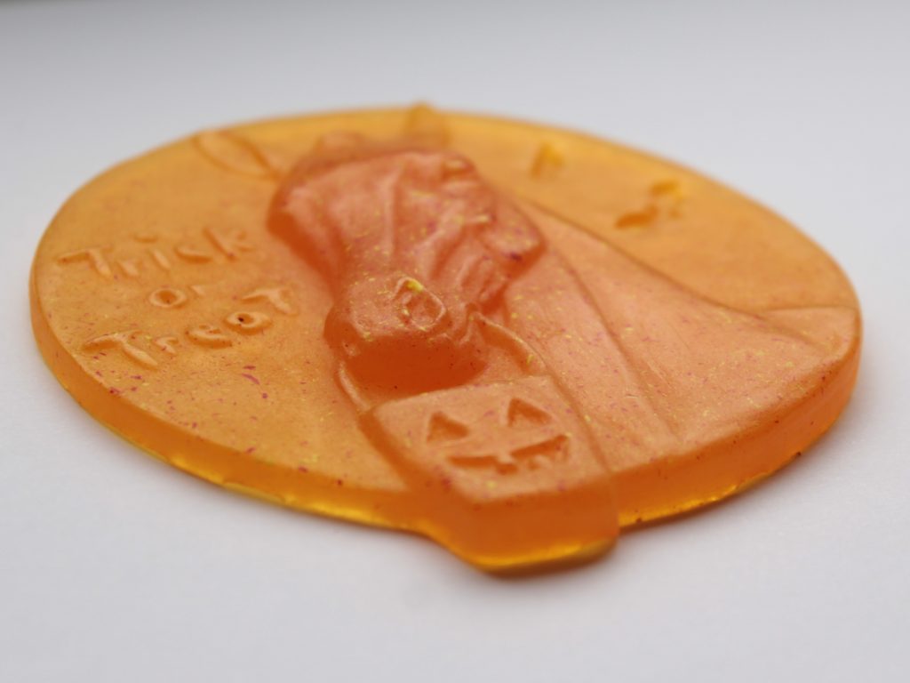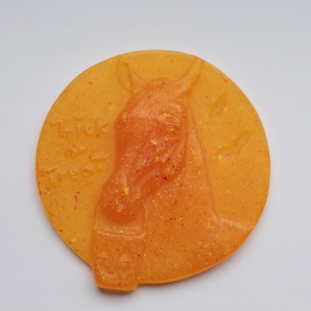 Das Medallion hat 9,5 cm im Durchmesser und wird in mit Acrylfarbe orange eingefärbtem durchsichtigen Resin auf Bestellung gegossen.
